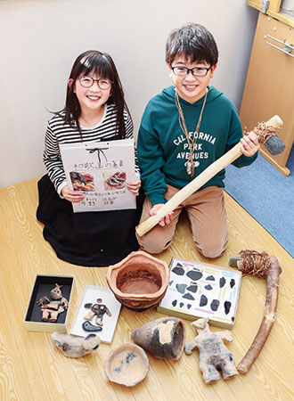 紀伊風土記の丘が主催する、昔の暮らしをテーマにした「チャレンジ!ジュニア学芸員 研究応募作品展」。個人・小学生の部で4年連続最優秀賞に輝いたのが、「縄文時代の食生活」について調べた川永小学校5年の河野仁宥くん(11、写真右)です。妹の3年、日香さん(8)も「和歌山の養蚕」で今年初出品し、優秀賞とそろって入賞しました。(文中敬称略)