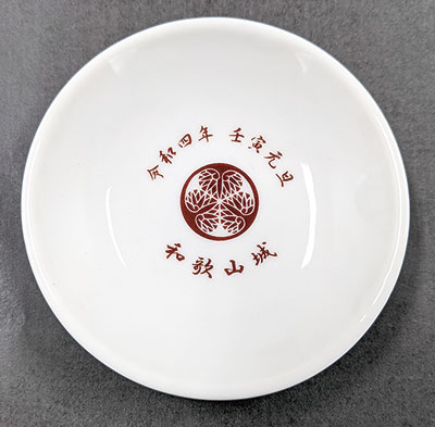 お城で配っているのは、直径8・5㌢、厚さ1・0㌢のさかずき型です。和歌山城整備企画課は「正月と言えばお神酒、おとそ。天守閣で新春初登閣を始めた1983年、記念になるものをと作りました。本来は素焼きですが、正月にお城へ来たと分かるよう、文字と紀州徳川家の家紋を入れています」とのこと。