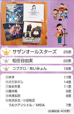 1位は日本を代表するロックバンド、サザンオールスターズでした。2位はユーミンこと、松任谷由実。この2組はデビューが1970年代で、欧米のロックやポップス、フォークソングなどの要素を取り入れたミュージシャンの代表格です。「学生時代から今まで口ずさんでいる」(60代男性)、「昔の曲を聴くと若いころの思い出がよみがえる」(60代女性)と、当時中高生だった世代にとって、青春を象徴する存在です。