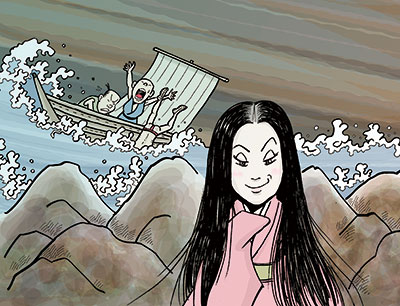 昔、すさみ町の里野に、長い黒髪を持つ、それは美しい磯女という妖怪がいた。夜、海に近い岩山に現れ、髪をかきなでながら、美しい声で歌うのだそう。ある日、この岩の側を船が通った。歌声が聞こえて来る方に目をやった船乗りたちが、岩の上にいる美しい娘に見とれていると、その娘は歌うのをやめて、にやりと微笑みかけ、手招きをした。すると、舵を切ってもいないのに、船はどんどん娘の方へと近づいていく。そして、とうとう岩にぶつかり、船は粉々になってしまった。不思議なことに、その後、船乗りたちが見つかることはなかった。