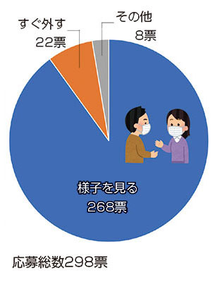 結果は298票中、「様子を見る」が268票と、約90%がまだまだ油断できないと考えていました。「変異株が流行しそう」(60代女性)、「感染者がなくなるまで」(50代女性)と、目に見えない脅威に不安が残るとの意見が過半数でした。