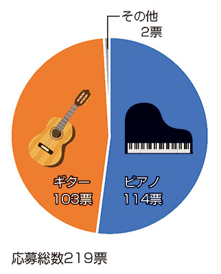 ギター103、ピアノ114、その他2と、それほど差はありませんでしたが、ピアノが少しだけ上回りました。