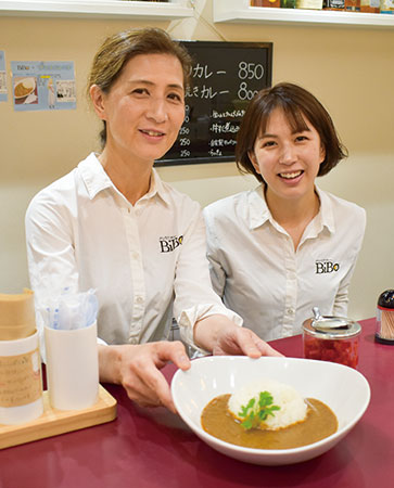 今年7月、移転5周年を迎える「ぶらくり丁カレーBiBo」。店を切り盛りする上野美保さん(59、写真左)が娘の花奈子さん(28)とふるまうのは、先代のレシピを引き継いだ自慢の味です。「どこか懐かしいとみなさん言ってくれる。だれでも気軽に入れる店づくりを目指しています」と笑顔を見せます。(文中敬称略)