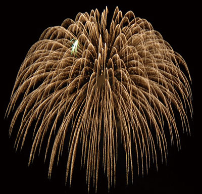 金色の長い尾を引く花火です。元々芸奴さんの髪型「禿(かむろ)」に似ていることから名前が付きました。ちなみに、銀色のものは「銀冠(ぎんかむろ)」と言います。