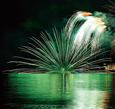 打ち上げ方でも見え方が変わります。▽海や川、湖などの水面に向けて発射し、着水ギリギリで花火が半球状に開く「水中花火」は、空中はもちろん水面に花火が映え、美しさが倍増します(写真下)。