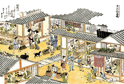 絵は、江戸時代後期の黒江(海南市黒江)の職人町をえがいた風景です。