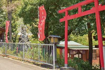 京奈和自動車道岩出根来IC出口から、泉佐野岩出線を北へ200㍍ほど行ったところにあります。数年前までは木々が生い茂り、あまり様子を伺えませんでした。現在は、赤い鳥居とのぼり、奥に何やら像のようなものが見えて目を引きますね。