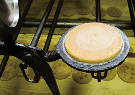 一枚ずつ焼くため、生地の分量や型への流し込み、焼き時間などで味が変わります。せんべい内の空気を均一にして同じ食感になるよう、同じペースで同じように焼き、焦げて苦みが出ないよう観海閣の焼き印は薄めに押します。焼くのはやはり夜中。時に夕方まで焼いても、1日600〜700枚が限界です。