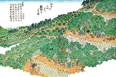 絵は、江戸時代後期に有田の段々畑でみかんを収穫している風景です。
