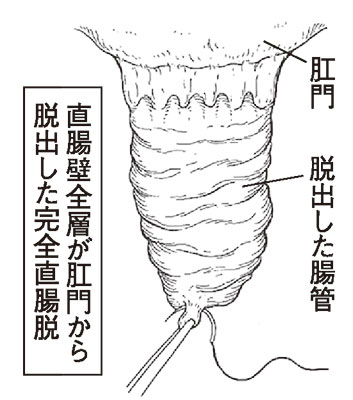 直腸脱と脱肛は、見かけ上は似ていますが、治療法が異なります。直腸脱は、直腸が全周にわたって肛門から脱出する病気です。直腸壁全層が反転して脱出している状態を完全直腸脱、直腸壁の粘膜下層だけが出ている状態を不完全直腸脱といいます。ただし、一般的には、直腸脱といえば完全直腸脱を指します。