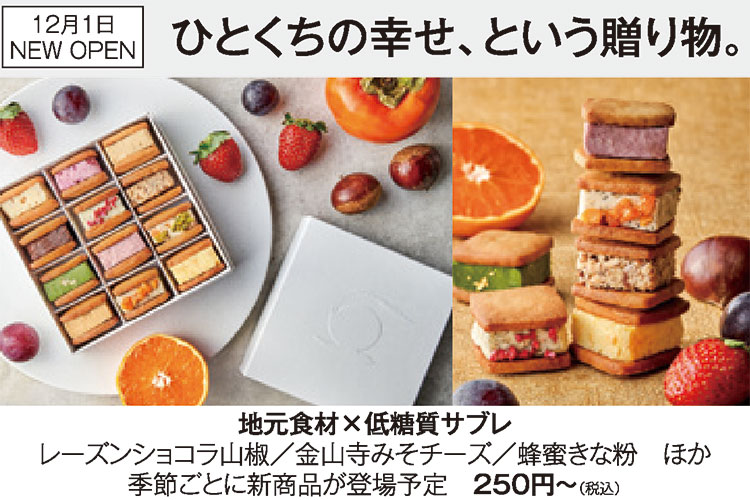 | 和歌山初のバターサンド専門店がオープン。定番から和歌山産食材を使ったものまで全12種類が並びます。サブレ生地には有田川町の醸造所で出た麦芽粕を練りこみ、香ばしさ・栄養価はもちろん、環境にもGOOD! 色々なフレーバーを楽しめる一口サイズで、お土産や贈り物にも喜ばれること間違いなし。 |