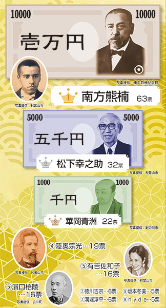 和歌山に暮らす人々の思いを読者アンケートから読み解く「よもやまリサーチリターンズ」。お正月特別版は、今年7月にお札が新しくなることにちなんで、「紙幣になってほしい和歌山の人物」を聞きました。(応募239票)