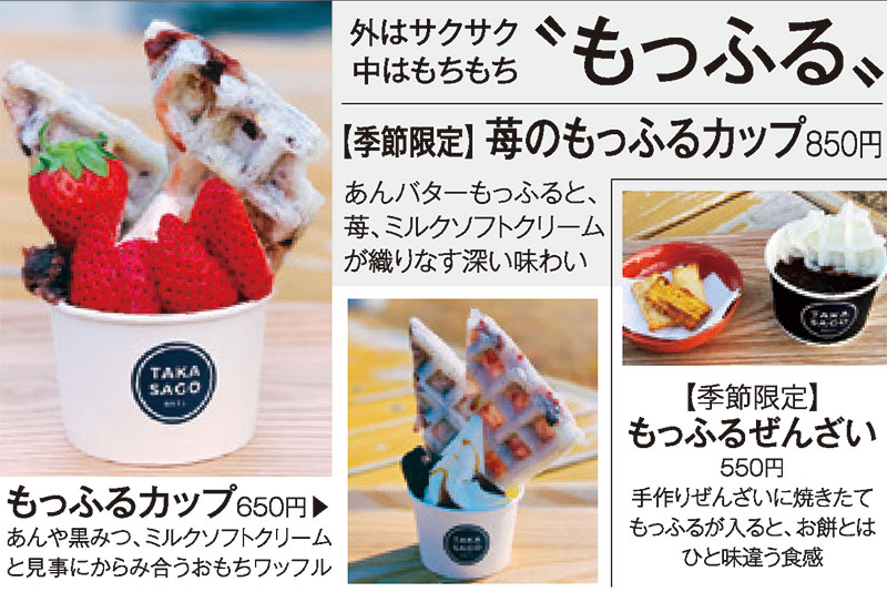 | 来年創業100年を迎える高砂アラレ。ワッフルメーカーでアラレに使うもちを焼き上げた「もっふる」が味わえる和風カフェを昨年末、岩出にオープンしました。フルーツ、あんこ、ハムチーズとコラボすれば、外はサクサク、中はもっちもちのもっふるが、それぞれの味を引き立てます。もちろん、高砂アラレも買えますよ。 |