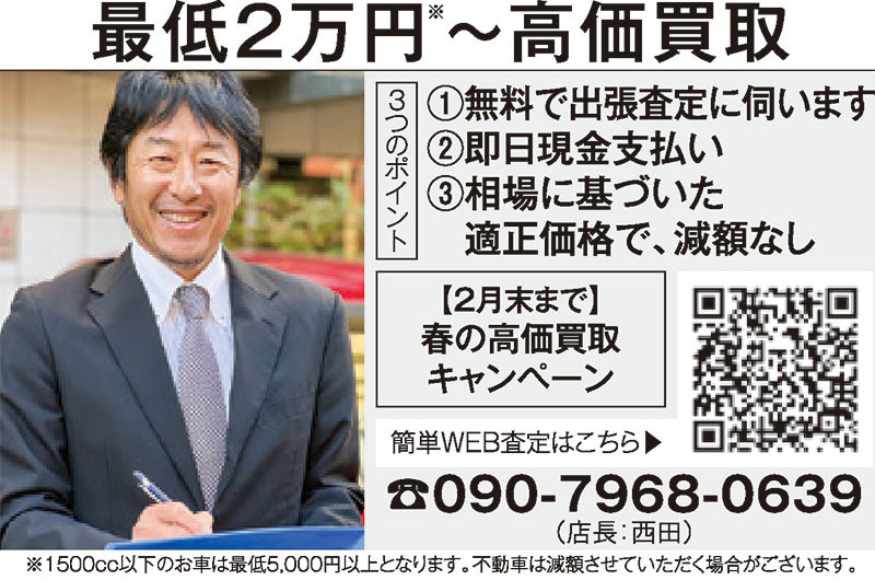 | 思い出のつまった大切な愛車を適正価格で買取りするハッピーカーズ和歌山海南店で、2月末まで春の高価買取りフェア実施中。「愛着のある車を納得して手放したい」「乗り換えるか車検を通すか悩んでいる」「免許を返納予定で車が必要なくなった」などのお悩みに、西田店長が丁寧に対応しています。出張査定無料。 |