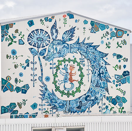 「桃山第2工業団地の工場の壁にある大きな絵は誰が描いたの?」。共栄テクシードの的場久揮取締役に聞くと、「巨大壁画などを手がける画家、淺井裕介さん」と教えてくれました。淺井さんは、泥やマスキングテープ、マーカーなど身近な素材を使い、動物や植物、また、顔や目、手などを複合的に絡み合わせ、建物内外に描く壁画が有名です。東京の代々木公園にある「植物になった白線」は道路用白線を地面に焼き付け、渋谷ヒカリエのデッキには力強い壁面アートを完成させました。