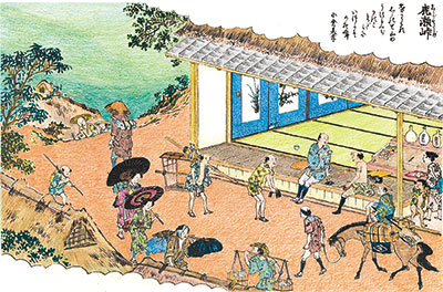 鹿瀬の大峠付近は平坦地になっており、玉屋・日高屋・虎屋の三軒の茶屋と藩主の休憩所がありました。絵図はそのうち一軒の茶屋の店先をえがいています。小荷物を担ぐ男女、荷駄を運ぶ馬の背に乗る武士など峠を越える人々の登りきった安堵の表情がうかがえます。茶屋で一服する二人に駕籠かきが近寄り、話しかけています。何って言っているのかな。