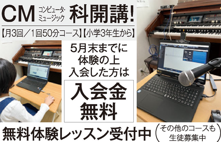 | ヤスムラビクトロンがいよいよCM(コンピュータ・ミュージック)科を開講。世間ではDTM(デスクトップミュージック)とも言われ、パソコンを使用して作曲・演奏・録音などを行います。楽器が演奏できなくても、パソコンに音符を打ち込むだけで作曲ができるので、この機会にチャレンジしてみませんか? |