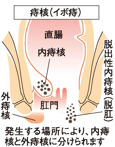 肛門にある静脈そうという血管のクッションは、 排便時のきばりに耐えたり、肛門を閉鎖する機能を持っています。 便秘などの排便障害や、肛門に負担がかかる日常生活が続くとこれが腫れあがり、 出血や脱出などの症状をきたします。これが痔の主な原因です。
