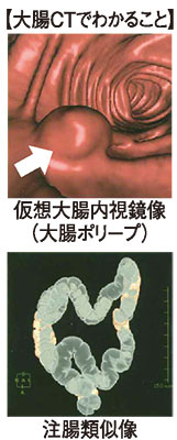 ただし、突然の発症や急速な増悪、貧血、予期しない体重減少、血便、微熱、消化器悪性腫瘍の既往歴や家族に病歴のある人がいる、50歳以上である等に該当する方は、器質的疾患を否定するためにも検便検査は必要で、陽性であれば精密検査して、前処置の下剤が少量で済む大腸CT検査(写真)や同時に治療できる大腸内視鏡検査などが選択できます。消化器病専門医、大腸肛門病専門医にご相談ください