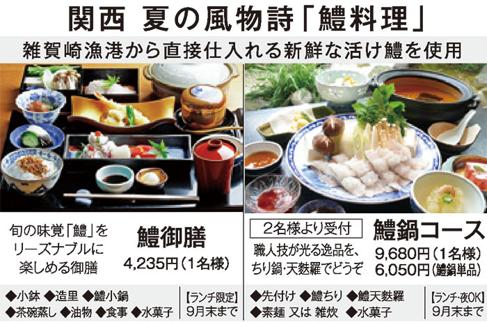 | 関西の夏の風物詩「鱧料理」。雑賀崎漁港直送の新鮮な鱧は、肉厚で脂のりが抜群です。一流料理人が丁寧に骨切りし、ふわりと心地よい食感を演出。湯にくぐらせると、ふっくらと美しく花開きます。器との取り合わせにも心を配り、舌でも目でも風情を堪能でき、お鍋、天麩羅など色とりどりの鱧料理を楽しめます。 |