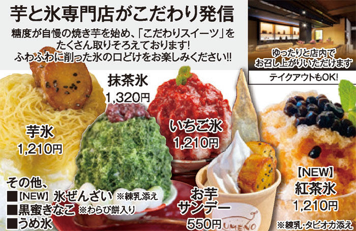 | 夏本番、やっぱり「ひんやり」できる夏スイーツがウレシイね。ふわふわサクサクの氷に、たっぷりのイチゴ蜜や抹茶がかかった定番は、安定のおいしさ。加えて、この夏は紅茶氷と氷ぜんざいの新顔も登場。どちらも甘い練乳とのコラボで氷バリエーションが広がります。お手軽なお芋サンデーもどうぞ! |