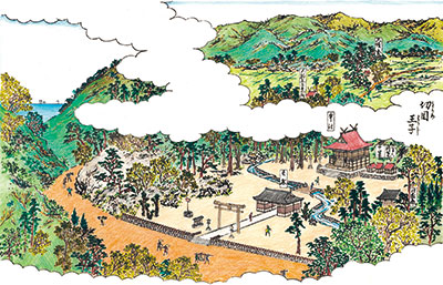 絵は、江戸時代後期の切目王子付近の風景です。境内は海岸段丘面にあたり、鳥居・「長床」と「本社」の間には小川が流れていますが、現在、小川はなく建物配置も異なっています。背景には印南付近の穏やかな枯木灘がみえています。