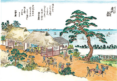 絵は、江戸時代後期の岩代の結び松付近をえがいた風景です。万葉集にでてくる「岩代の岸の松」の地形は急峻な段丘崖とその上の海岸段丘面(標高35㍍余)にあたり、現在、そこには国道42号沿いに「有間皇子結び松」の大きな記念碑が建っています。それは、同皇子が謀反の嫌疑で捕えられ、護送の途中、松の枝と枝を結んで行路の無事を祈ったことに由来します。この辺りは眺望がよく、南部湾から田辺湾まで絶景が見渡せます。