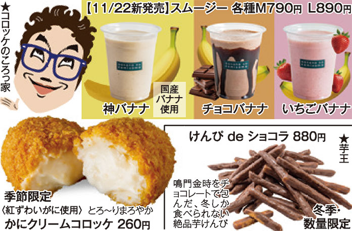 | ものまねタレント、コロッケさんプロデュースのお店「コロッケのころっ家」から11月22日、スムージー新発売!! 全部で3種類、どれもおいしそう♪ 紅ずわいがにを使ったかにクリームコロッケは、ちょっとごちそう気分。また、同じ店舗内にある熟成焼き芋「芋王」では、プレミア感あふれるけんぴdeショコラが人気です。 |