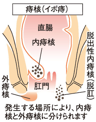 痔とは、肛門にある血管や、静脈そうという結合組織からなる柔らかい肛門のクッションが腫れ上がることで発症します。男女差はなく、45~65歳が最も多いといわれます。