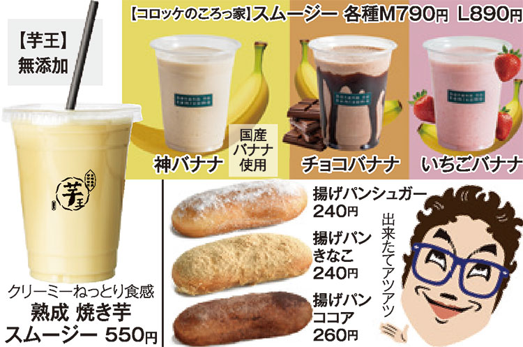 | 和歌山ミオ本館1階で大注目!! ものまねタレント、コロッケさんプロデュース「コロッケのころっ家」と、熟成焼き芋「芋王」のコラボショップ。この冬、両店から素材の味を生かしたスムージーが登場。お好きな味を選んでね。昔懐かしい揚げパンは3種類。出来たてアツアツ、ふっくら柔らか。いくつでも食べたくなるよ。 |