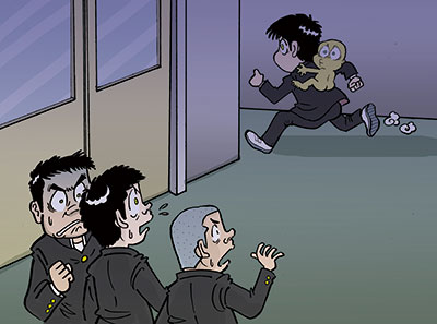 海南市のAさんが中学生の頃、夜の学校にあやしい人影が現れると噂がたった。廊下を疾風のごとく走りぬける黒い影という。好奇心旺盛なAさんは友人らと夜の学校に忍び込んだ。早速、廊下を走る足音がしたかと思うと、目の前を黒い影が走りぬけた。正体はお調子者の同級生Cだったのだ。しかも首に当時流行していたダッコちゃん人形を巻きつける冗談っぷり。翌日Cを問い詰めると、笑いながら『皆を驚かせてやろうと思って…』と白状した。しかし、ダッコちゃんはつけてないという。その日の体育で、Cは首を怪我した。あのダッコちゃんの仕業ではとAさんは思った。