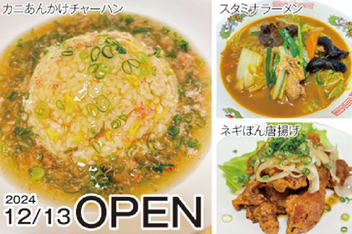 | ご近所さんや子連れ家族が通うお手ごろ価格の町中華がオープン。人気のカニあんかけチャーハンは、胃に優しい和風味。カニの身たっぷりの餡が体の中から温めてくれます。豚骨ベースのスタミナラーメンや、カリッとジューシーなネギぽん唐揚げなど、ラインナップ豊富!!お弁当・単品テイクアウトOK! |