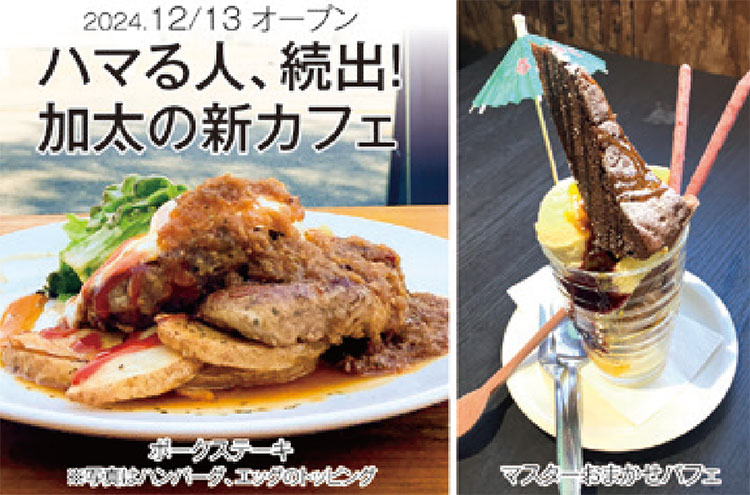 | 日高川町に移住したバイク好きのカフェオーナーが心機一転、屋号を変えて加太に新店オープン。看板メニューは限定10食のポークステーキ250g! 肉汁を生かした絶品ソースで分厚いお肉を堪能。パスタやスイーツなど、どれも食べ応えバツグン。陽気な日はテイクアウトし、店の前の公園へ繰り出すのもGOOD! |