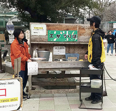 エサやりが一段落したらスタッフの昼休み。ご飯を食べて元気になったら再び園舎の掃除です。また、13時半から14時に、エサやり体験会をお手伝いします。1カップ100円で販売しています。