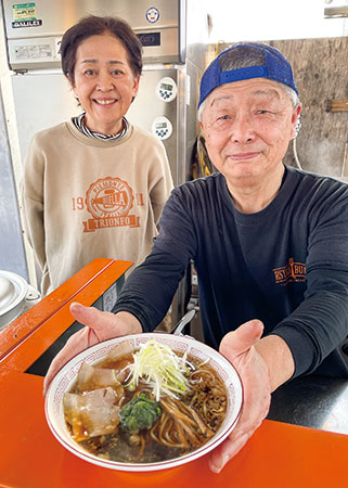 「パンチがありながらもスッキリとした、どれだけ食べても飽きのこない一杯です」と胸を張るのは、2月に和歌山市湊にオープンしたラーメン店、「おかんとおとん」の髙橋吾一さん(69)と妻の美千代さん(67)。ハンバーガー店の駐車場に建つ屋台は、どこか昭和の空気が漂います。