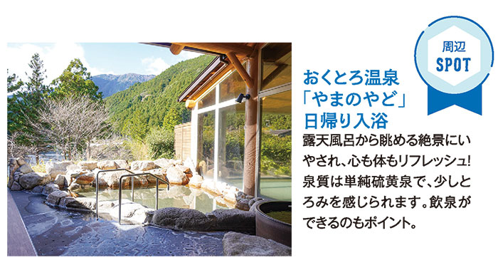 | 瀞峡上流の奥瀞(おくとろ)に位置する、山に囲まれた道の駅。おくとろ公園の中にあり、コンビニ、温泉、食事処、宿泊施設、テニスコートなども設備されています。露天風呂からの眺めがとても美しい温泉は、飲泉も可能。北山村をまるごと楽しみ、リフレッシュできる道の駅です。 |