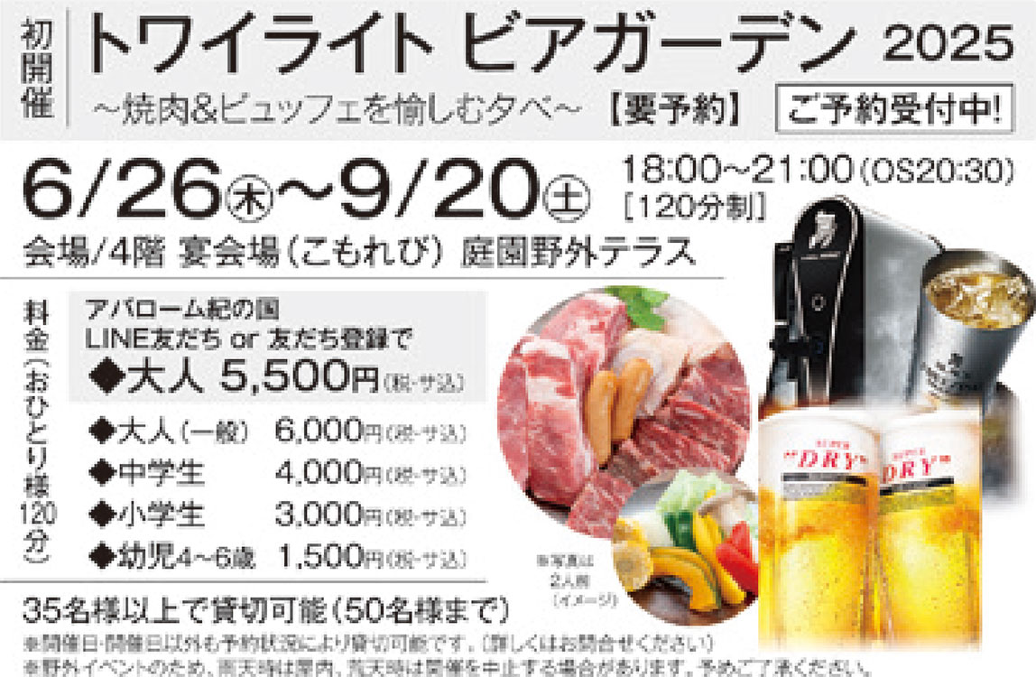 | ホテルアバローム紀の国では、今年初開催のビアガーデンを実施! ホテル4階庭園の野外テラスで、焼肉&ビュッフェとドリンク飲み放題が楽しめます。夕暮れに包まれる開放的な空間で、夏の贅沢なひとときをゆったりとお過ごしください。毎夏恒例のバイキングも、もちろん開催! 今年のテーマは「ハワイ」です。 |