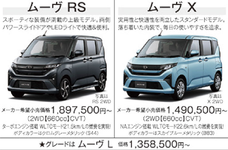 | 新型ムーヴ、ついに登場! シリーズ初のスライドドアで、乗り降りのしやすさが格段にアップし、買い物や送迎もスムーズ。しかも低燃費で家計にやさしい♪ 13色のスタイリッシュなボディカラーと、スマートアシスト等進化した安全性能も魅力。毎日の運転がもっと快適に、家族にも、自分にも、うれしい1台です。 |
