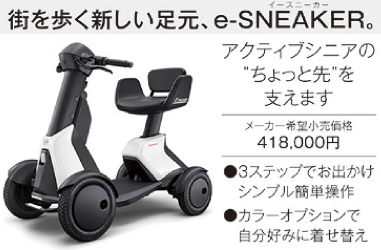 | ダイハツから新登場の電動パーソナルモビリティ「e-SNEAKER」。四輪で安定し、段差や傾斜に強いのが特長です。脱着式バッテリーは家庭充電約2.5時間、満充電で約12km走行。免許不要で買い物や通院など近距離移動にぴったりです。最高速度6km/h、安心して“ちょっと先”へ。街歩きがより軽快に楽しめます。 |