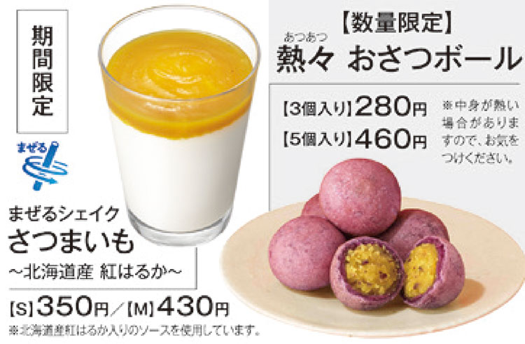 | 昨年ご好評いただいた「さつまいも」シリーズ、今年も登場します! 北海道産紅はるかを使用した濃厚なさつまいもソースとモスシェイクバニラの「まぜるシェイク さつまいも」。「熱々 おさつボール」は、紫芋パウダーが練りこまれたもちもちの生地に、やさしい甘さのさつまいも餡を包み込みました。 |