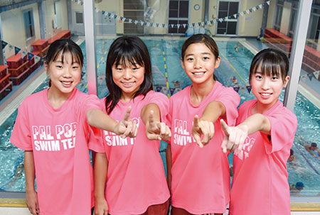 「4人一緒に表彰台に立てたことがうれしかった。一番上から見る景色は違いました」。とびうお杯女子4×50㍍フリーリレーで、1分54秒65で優勝。晴れ舞台を思い返しながら笑顔を交わす。