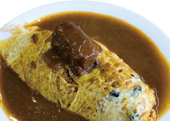 人気の「オムカレー」もお客さんの発案です。ピリッとスパイスが効いたドライカレーをまろやかなカレーと卵が包み込み、相性バッチリ。お皿いっぱいのボリュームなのにペロリと食べられます。大きな牛肉が目を引くビジュアルは、写真映えも抜群。「SNSで見つけてくれた若いお客さんが増え、賑やかになりました」。