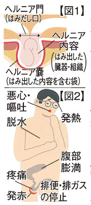 放置すると「嵌頓(かんとん)」を起こし、激しい痛みや腸閉塞に至ることがあります。足のつけ根のふくらみを感じたら、早めに受診をお勧めします。