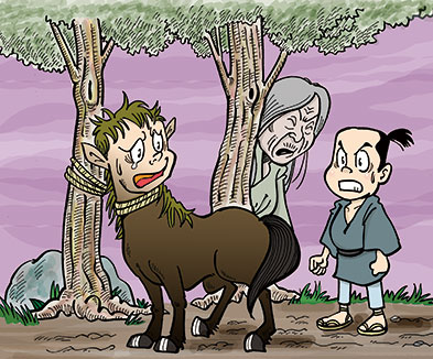 裕福な家のAと貧しい家のBは仲良し。ある日、そんな二人が旅に出た。途中、山の中で夜になったので、一夜の宿を求めた。宿の主は快く二人を迎え入れた。翌朝、主がだんごを振舞ってくれた。お腹がすいていたAは早速それをほおばると、Aの姿は見る見るうちに馬に変化した。Bは慌てて外に飛び出て助け求めた。たまたま通りかかった老人に訳を話すと「一本の木に七つ実のついたなすびを食べさせなさい」と言う。Bはあちこちを探し回り、ようやく七つの実のついたなすびを見つけて、宿に戻った。馬と化したAにそれを食べさせると元の姿に戻ったという。