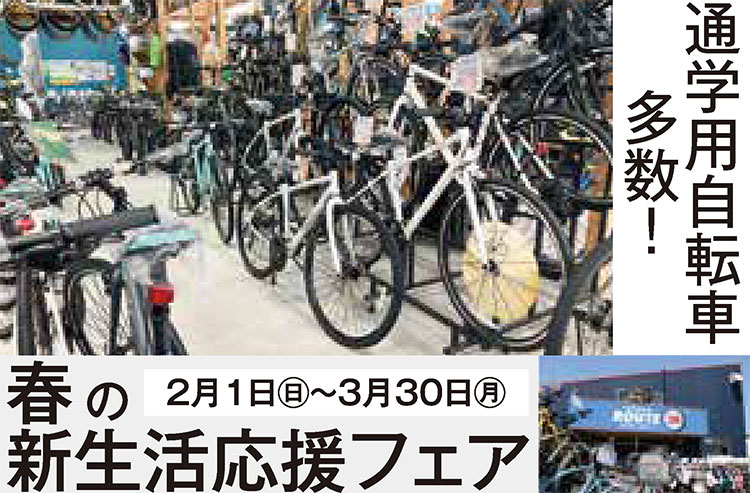 | ロード、クロス、MTB、折りたたみなど豊富な車種がズラリと並ぶ地元密着40年以上の専門店「ちゃりんこルート26」。進学・進級シーズンに向け2月1日㊐から「春の新生活応援フェア」を開催! 電動アシスト付きから通勤・通学用、ヘルメットなど多数取り扱い。この機会に自分だけの1台と出合おう! スタッフ募集中! |