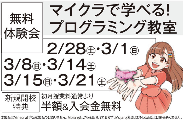 | 世界中で大人気の「マインクラフト」を使った『コードアドベンチャー』がJR和歌山駅前に開校! 「楽しい!」から始まる学びで、試行錯誤する力や集中力も自然と身につき、小学校低学年からでも始められます。ただいま無料体験会を開催中! はじめてのお子さまも安心してご参加いただけます。 |