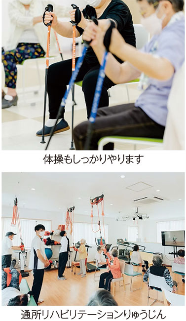より医療的なサポートを必要とする方には、院内の通所リハビリテーションりゅうじんが対応。理学療法士が一人ひとりの状態に合わせた個別メニューを作成し、生活機能向上(2〜3時間)と集中トレーニング(2時間以内)の2コースで、整形外科直営だからこそ実現できる専門性と安心感のあるリハビリを提供しています。