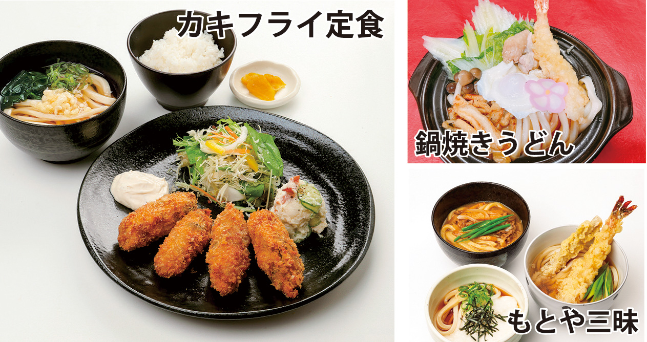 これからの季節限定大粒の「カキフライ定食」 天麩羅・カレー・山芋とろろ三種の味が楽しめる「もとや三昧」 寒い季節にぴったり あつあつ「鍋焼きうどん」 |