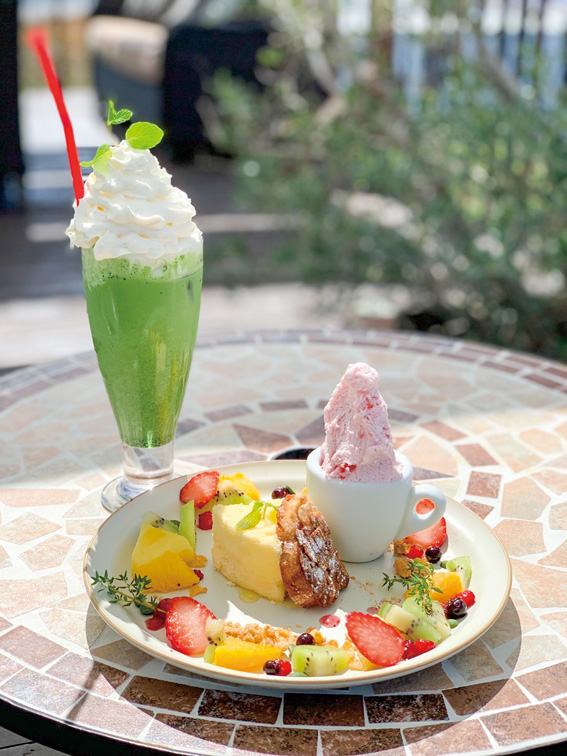 チーズケーキ、選べるジェラート、 フルーツ、アーモンドラスク ○幸せのチーズケーキプレート 宇治 山政小山園の抹茶を使用 |