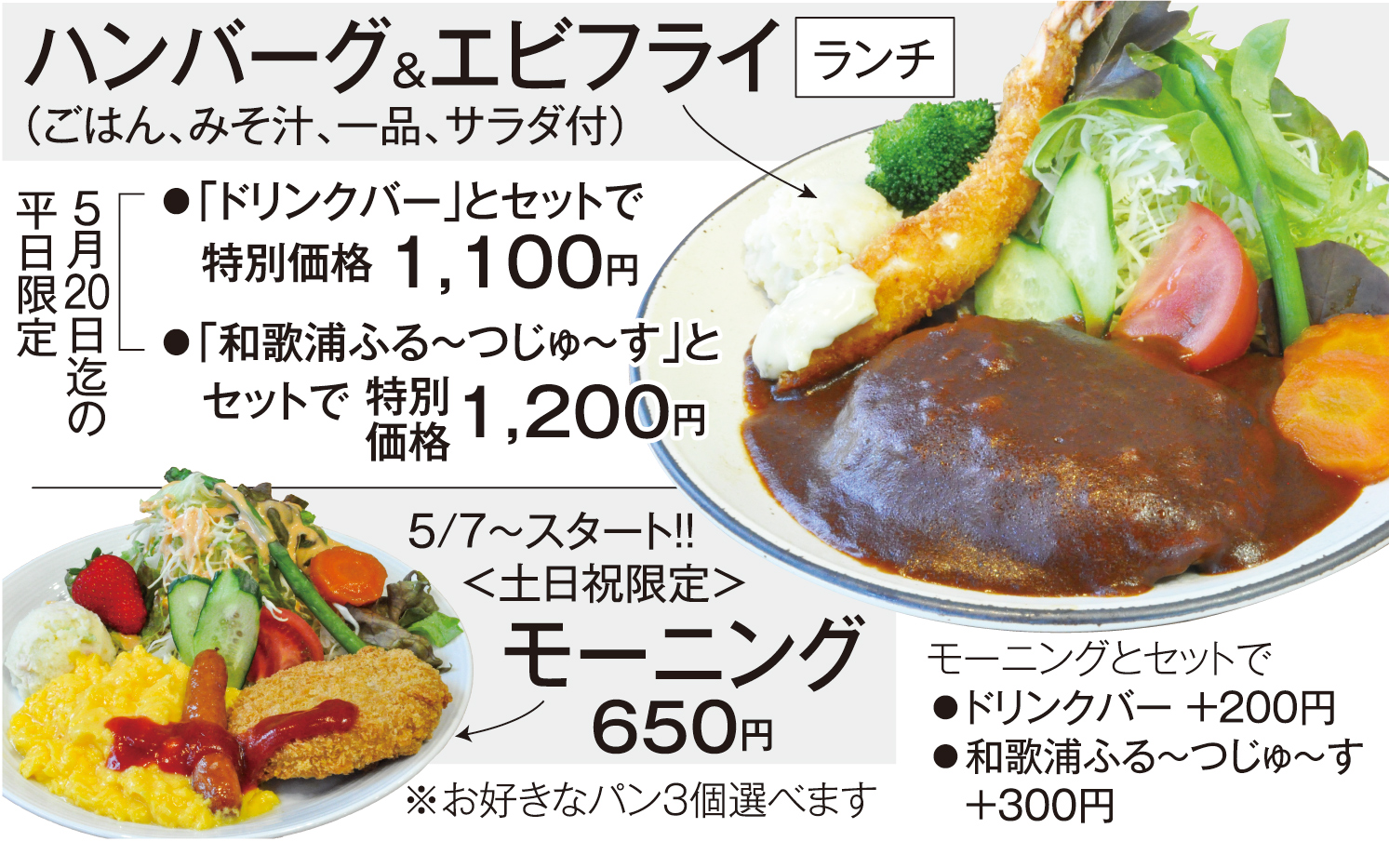 ☎073-488-2468 和歌山市和歌浦東3丁目4-16Ⓟ有 営業時間/(5月より) 土日祝8:00〜15:00(OS14:00、モーニングはOS11:30) ㊡水曜、月2回不定休 ※4/29、5/1・3・4・5休み |